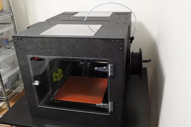 After encountering some warping issues on my TAZ 6, I designed and built an enclosure to help keep the environment consistent. The electronics is outside of the enclosure and it fits the outside of the TAZ 6 like a glove. There are cutouts for all the protrusions on the frame including screws and the spool holder system. I’ve got two fan mounts for adding ventilation later and I’ve also got a couple of mount points for adding a spool holder on top if I want it.