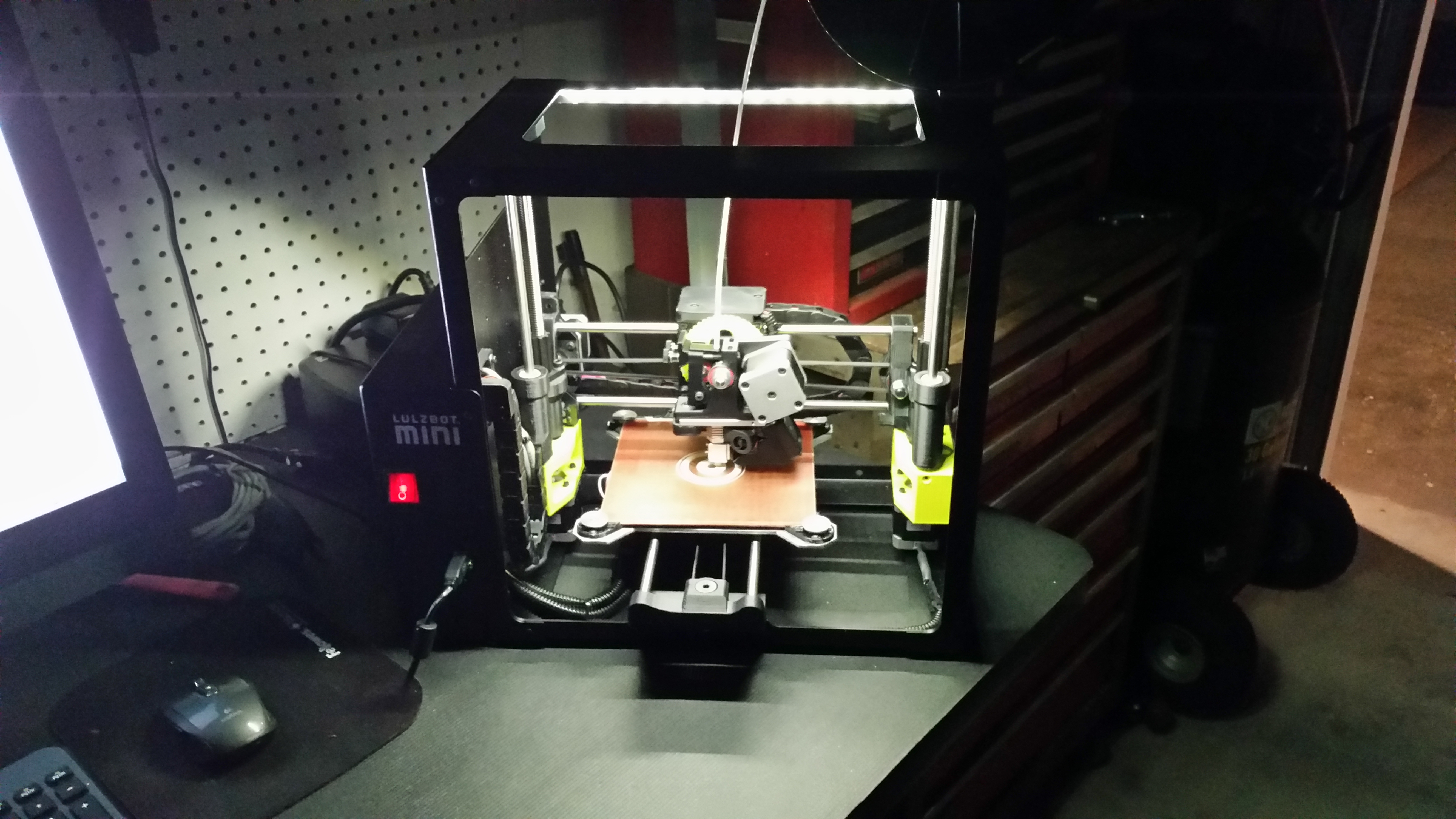 I just designed a quick work light / bed light add-on for my mini. It uses a $10 Nebo Larry C LED flashlight and the previous existing LCD mounting holes in the top of my frame. (hopefully the newer Lulzbot Mini’s still have those mounting holes.)