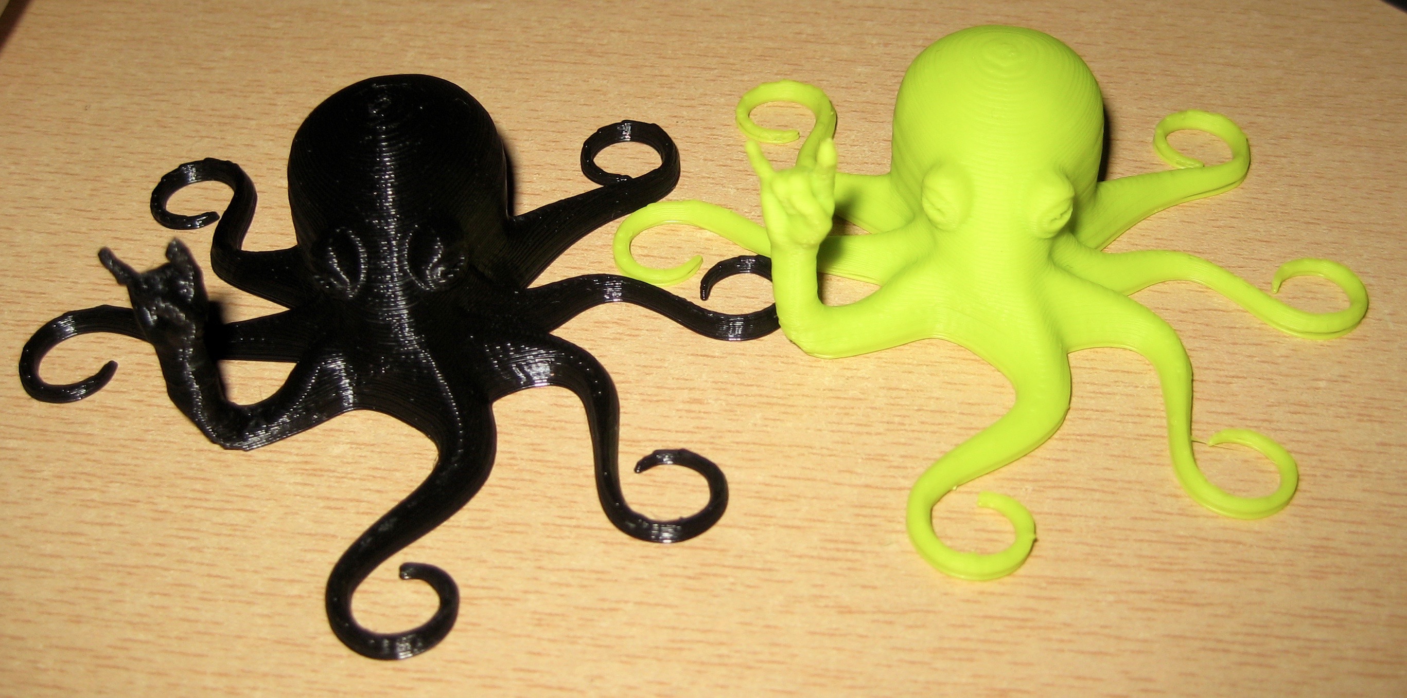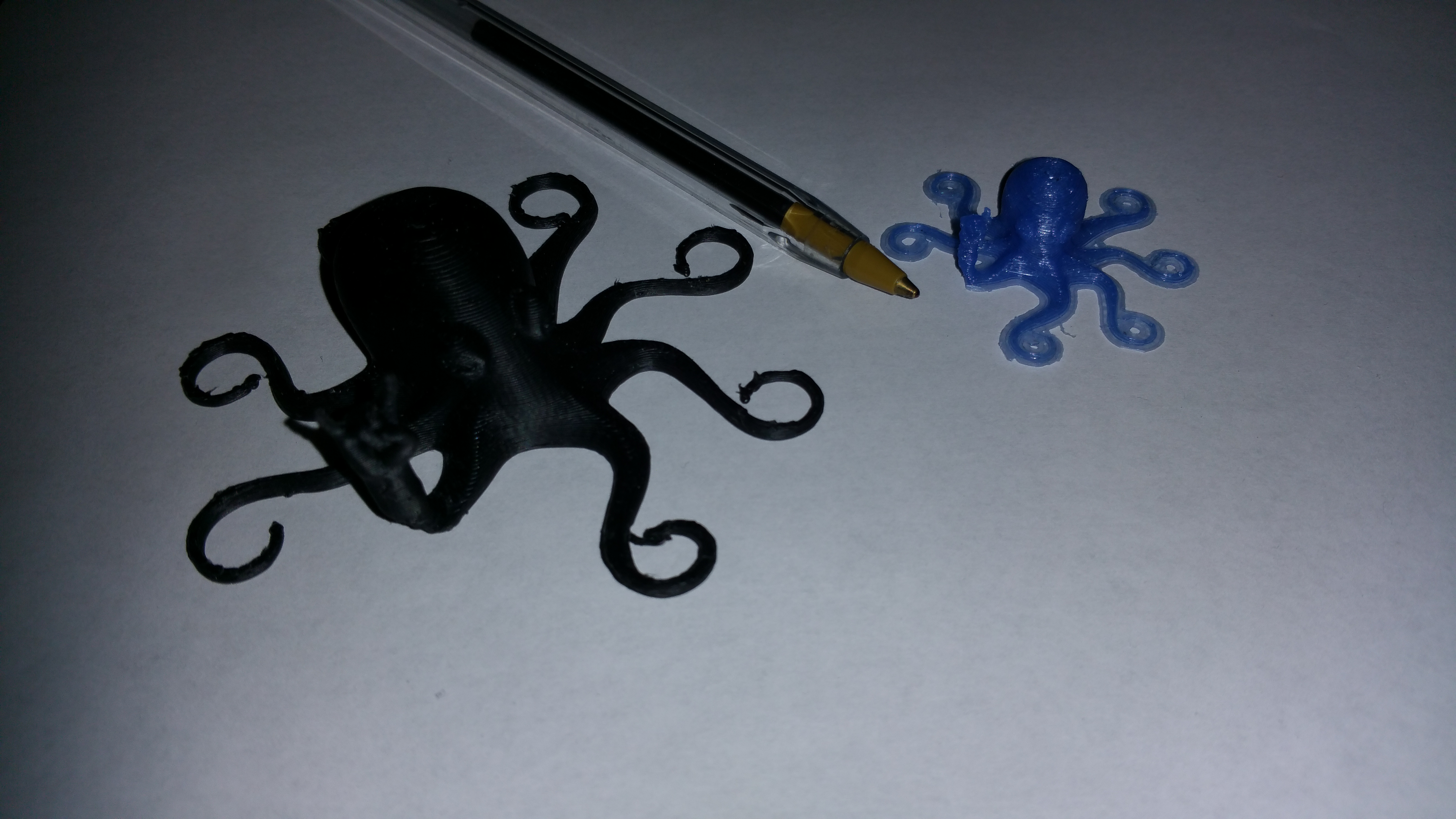 These Roctopi were NOT all identical (e.g. not the same STL, much less the same gcode.) Unfortunately that means detailed comparisons can’t be made (e.g. the shape of the forearm differs in the PET+ (black) model because of a difference in the STL).
