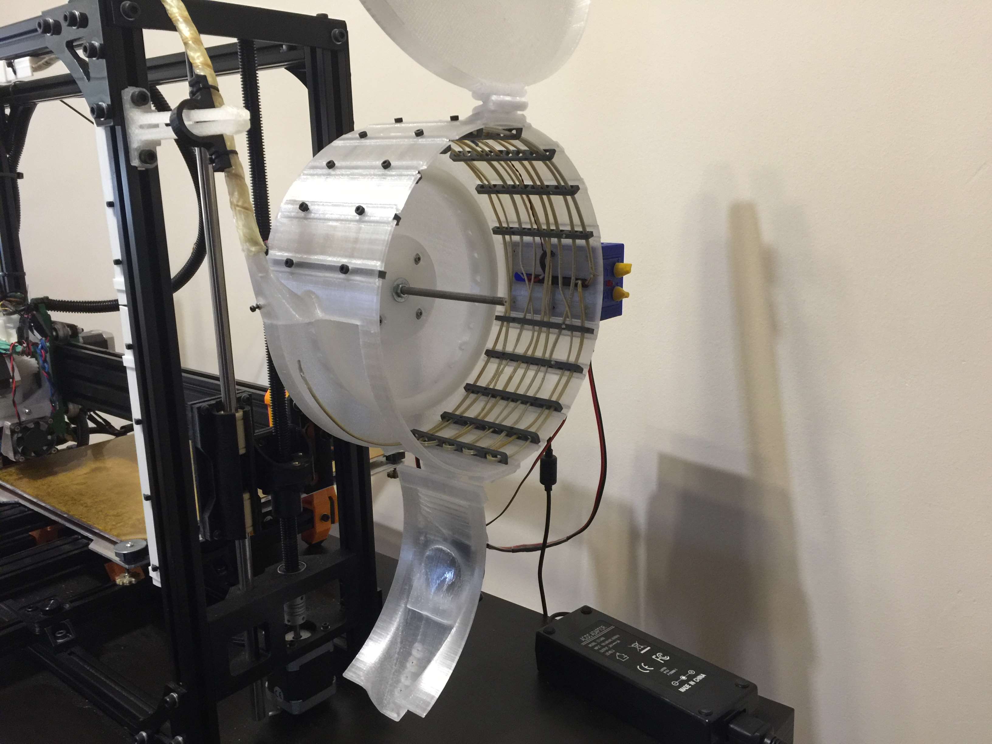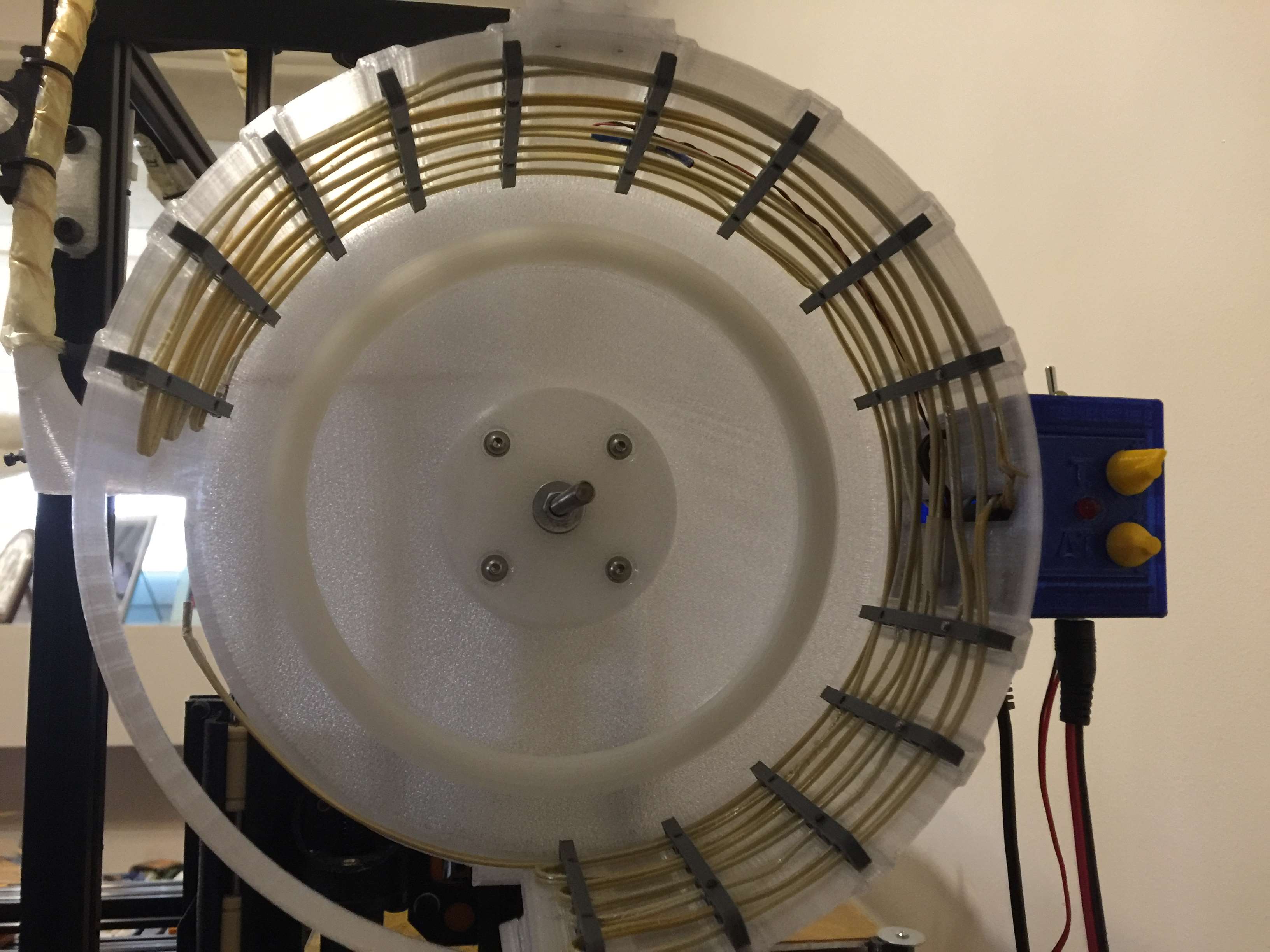 The blower fan help to circulate the hot air inside the box, improve the drying process and protects the box from overheating the walls. Early designs didn’t have the blower and the box, running on 48W (2x24W hotwires), was getting really hot on top (heat goes up, right?) affecting its shape! Now the temp goes up to 65-70C and works great. Running 24W on the PTFE tube rises the temp up to about 65C.