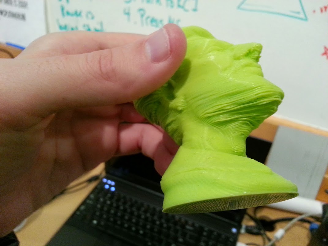 They told me the best they have been able to do is the soldier head model. The green model was printed on their TAZ 4. The yellow was printed their MakerBot Replicator 2.