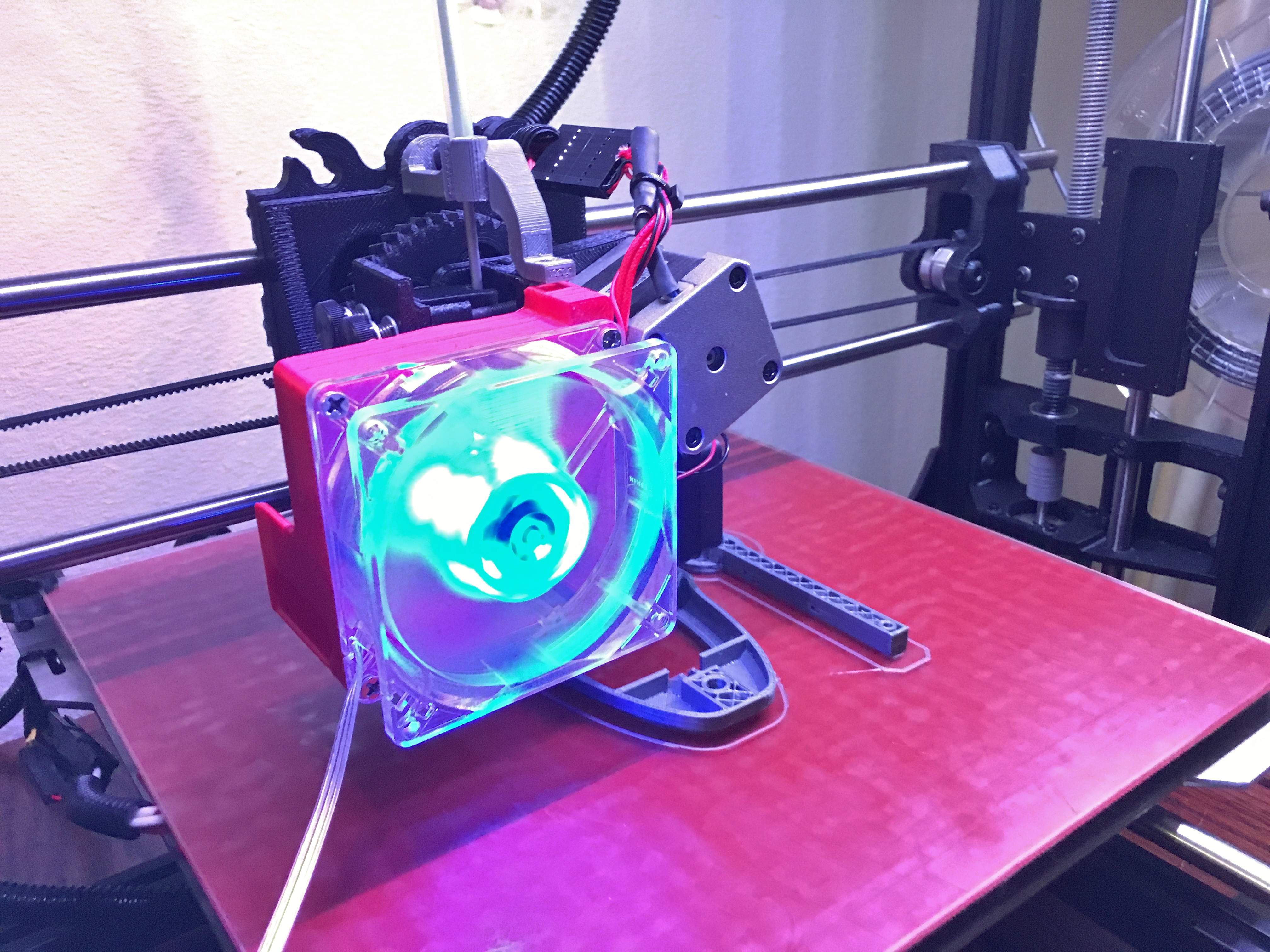 We both agreed that I was the victim of heat creep, which really should have been avoidable. But from what I’m reading on these forums, I’d bet that there are a good many of you falling victim to the same issue. Personally, I’m a ‘little’ stubborn sometimes, and I have a need to make things work. So here I am thinking - “I have a heat issue. I’m gonna fix this ONCE, and be done.” What did I do? I took an 80mm fan from one of my computers, along with the power supply, I cut an old cd in half, and I literally double sticky taped the thing on the front of my extruder assembly. I used the pieces of the cd to direct the fan air flow to the cooling fins of the extruder, while isolating the hotend itself. Here’s 2 pictures from my hacker “Wall of shame”:It wasn’t pretty. I had a lot of zip ties holding things out of the way. And I had a pc power supply hanging from the back of my Taz frame… But IT WORKED. I was able to dial in my first layer to be within .01mm every time, with what I felt was near perfect results (fill, overlap, etc…)