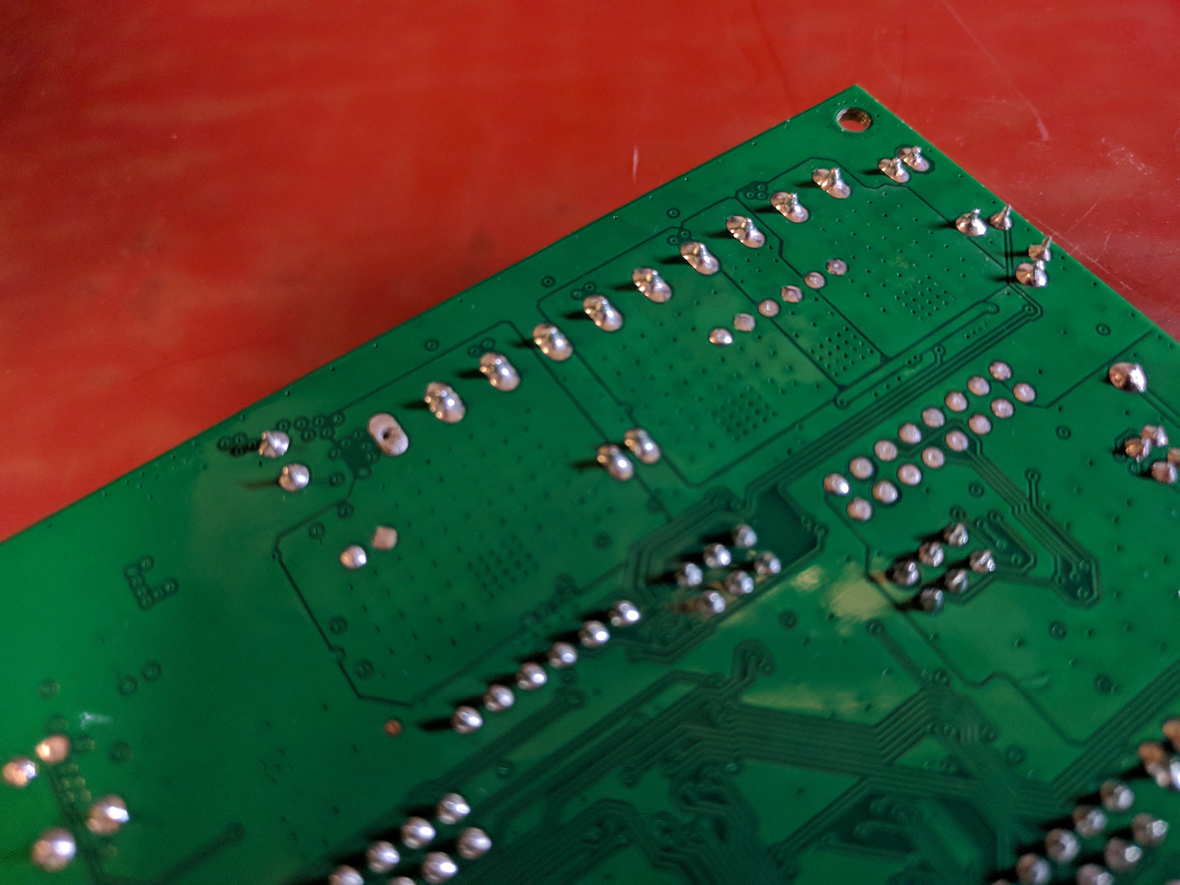From the back you can see the solder has been melted on the leftmost solder pad in the line of through-hole connectors for the black connector. Crazy that those pins get that hot. Perhard the connection was just not quite good enough and heating up with all of that current passing through?